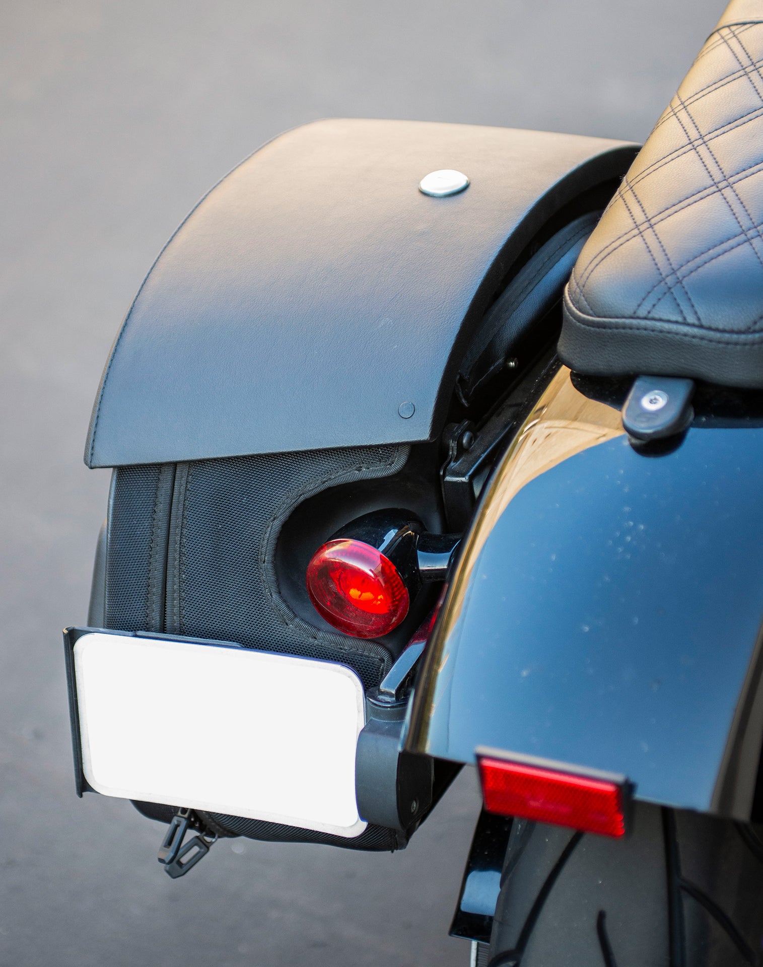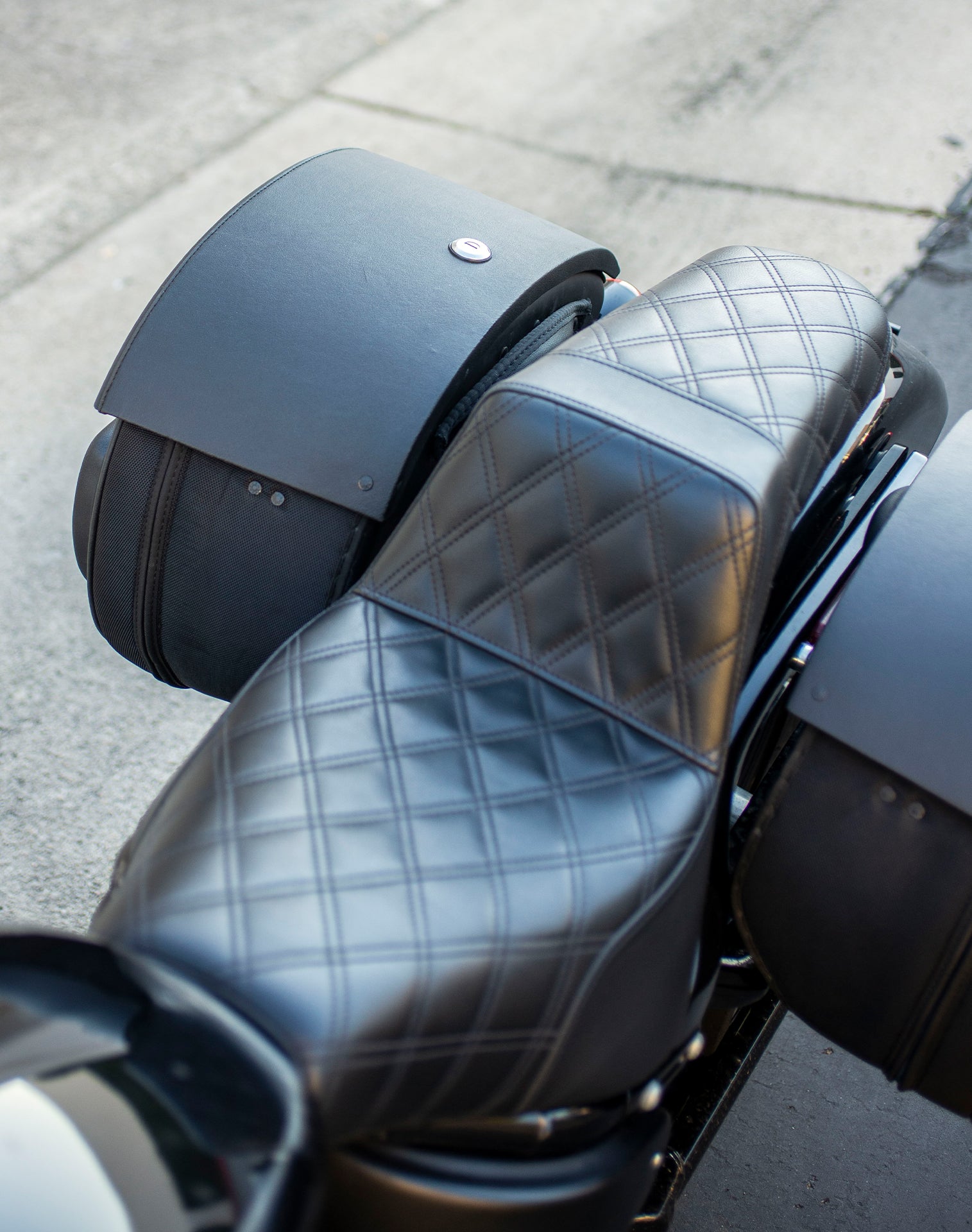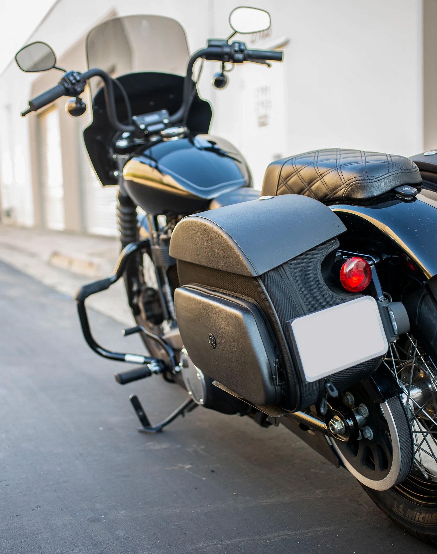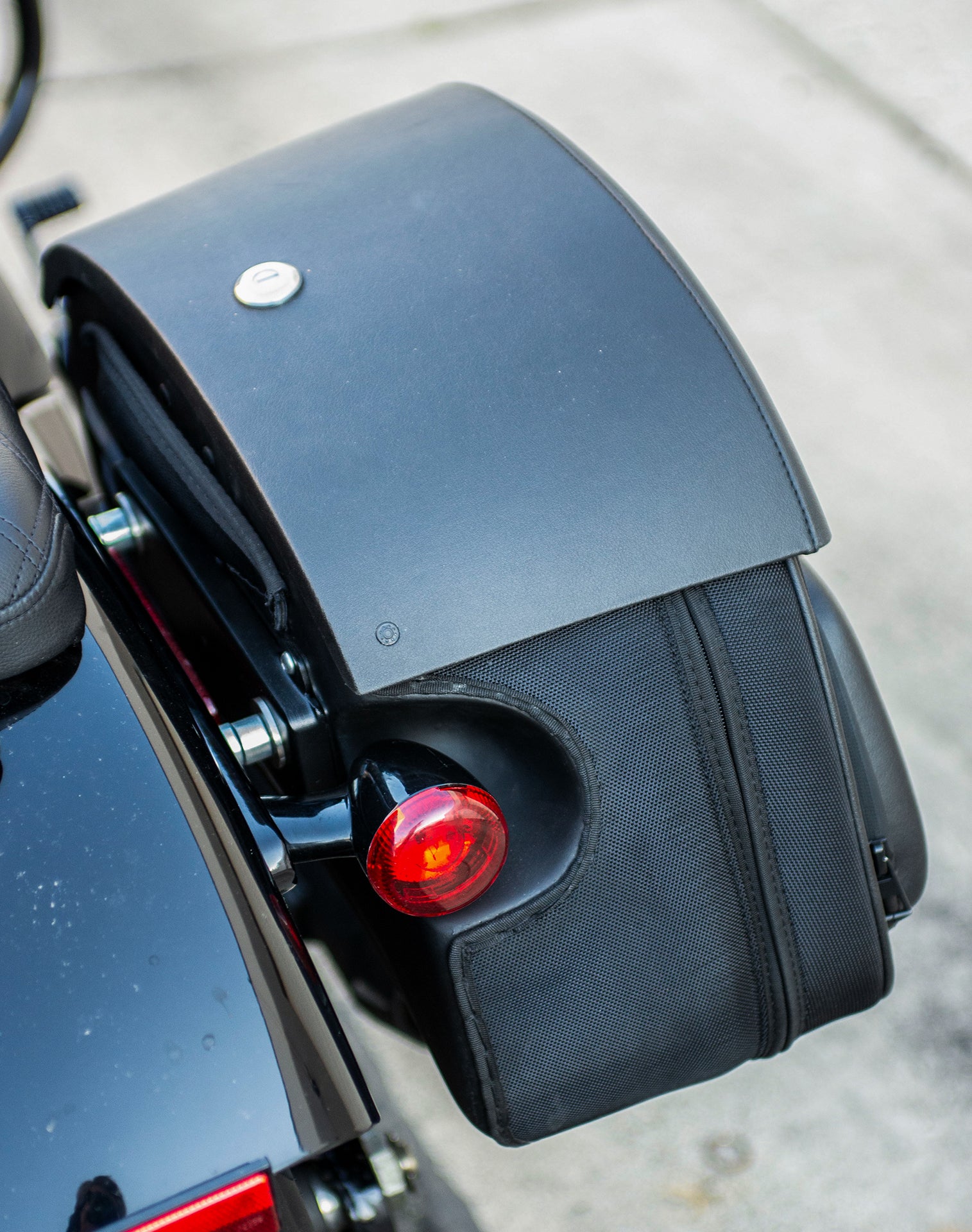 32L - Darkin Large Quick Mount Leather Wrapped Hard Saddlebags for Harley Softail Street Bob FXBB
