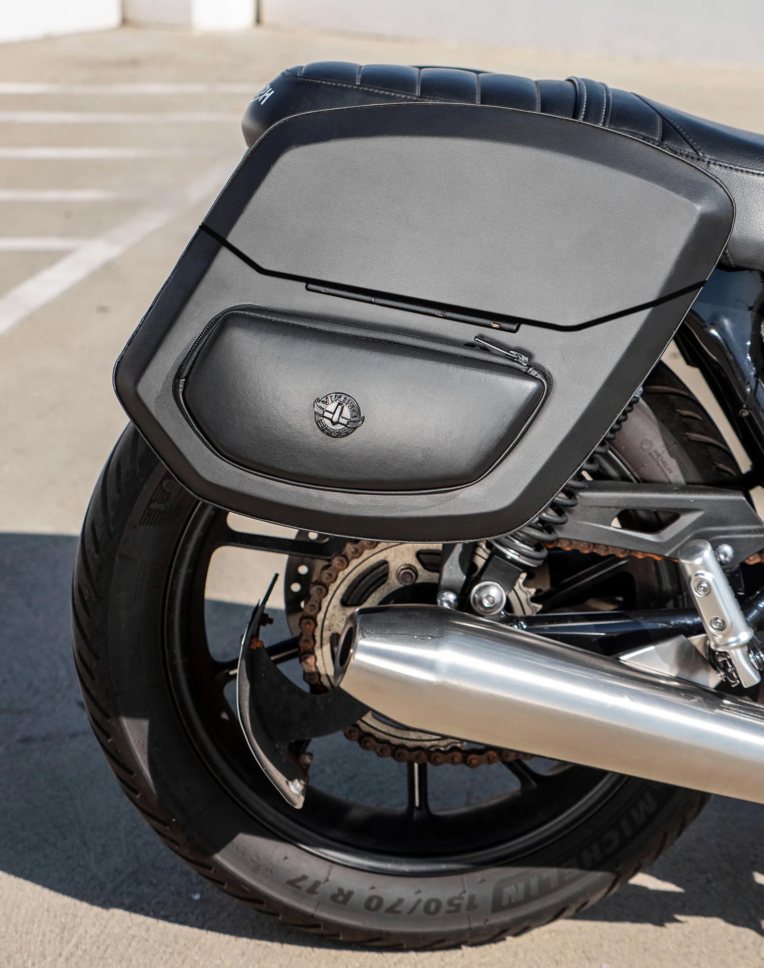 The Viking 24L Ironclad leather wrapped Triumph Speed Twin 900 (2022-24) leather wrapped medium hard saddlebags combine durability with convenience. The quick-mount feature allows for easy installation and detachment, while an outer pocket and stylish strap add functionality and a classic look. With 1464 cubic inches of storage, a detachable organizer, and an anti-theft lock, these leather covered bags are perfect for any adventure.