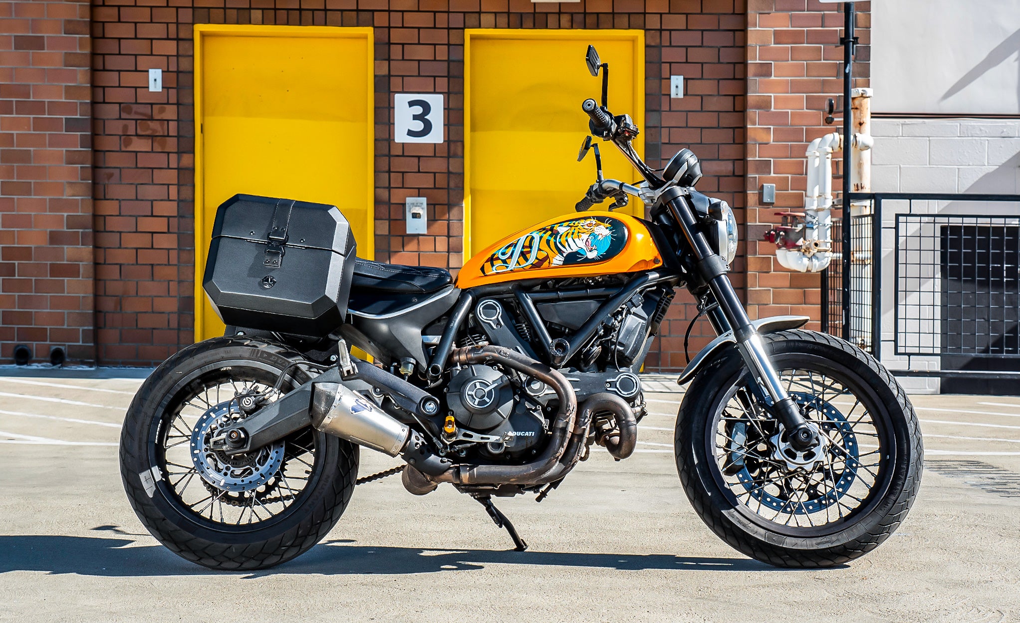 20L - Outlaw Quick-Mount Small Ducati Scrambler (2014-17) Leather Wrapped Hard Saddlebags