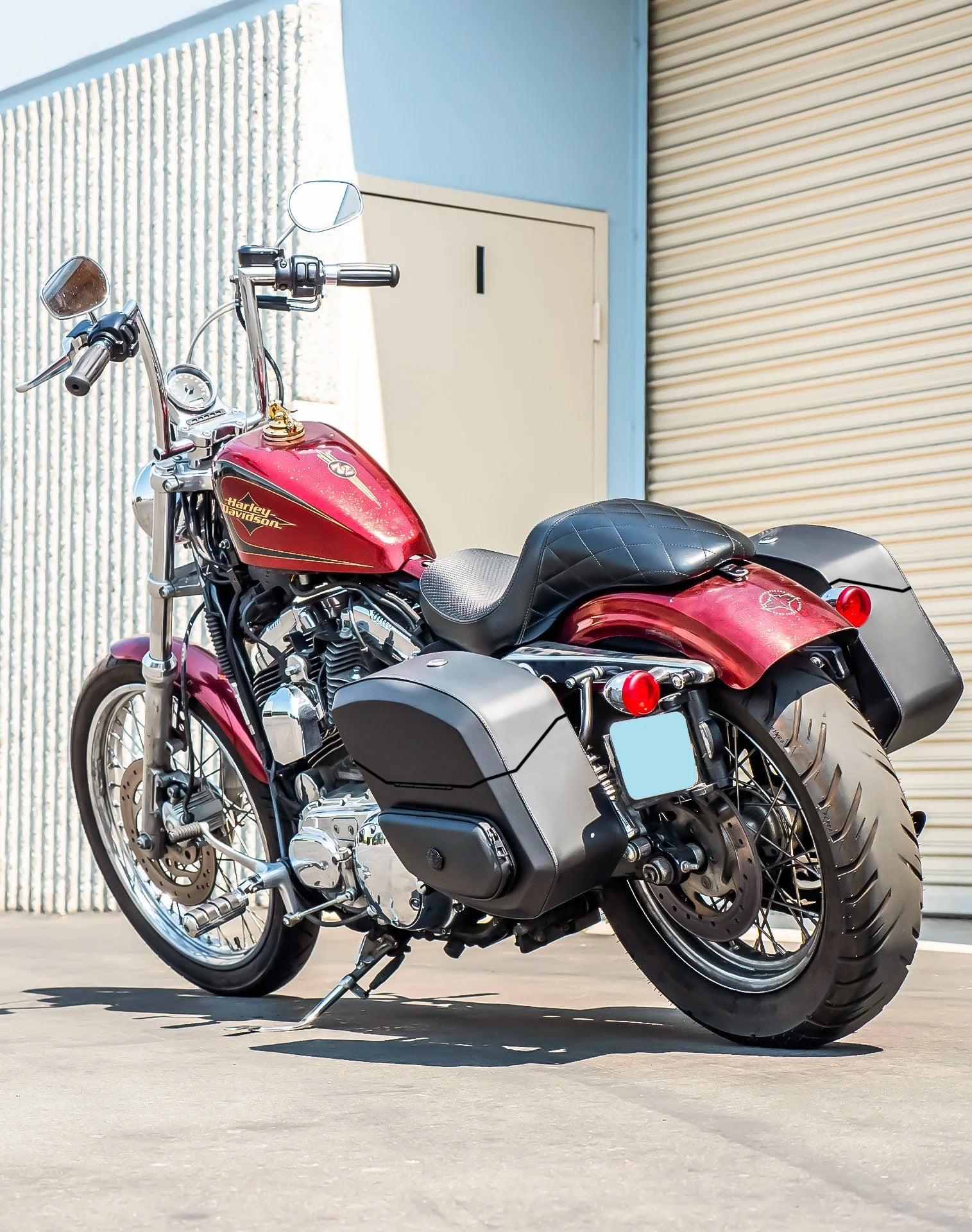 24L - Ironclad Quick-Mount Medium Harley Sportster Seventy Two XL1200V Leather Wrapped Hard Saddlebags