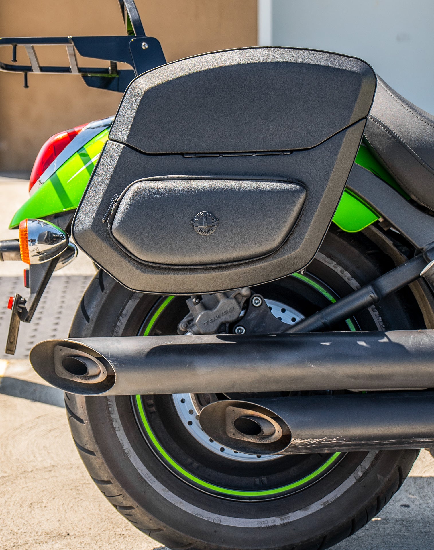 24L - Ironclad Quick-Mount Medium Kawasaki Vulcan 900 Custom Leather Wrapped Hard Saddlebags