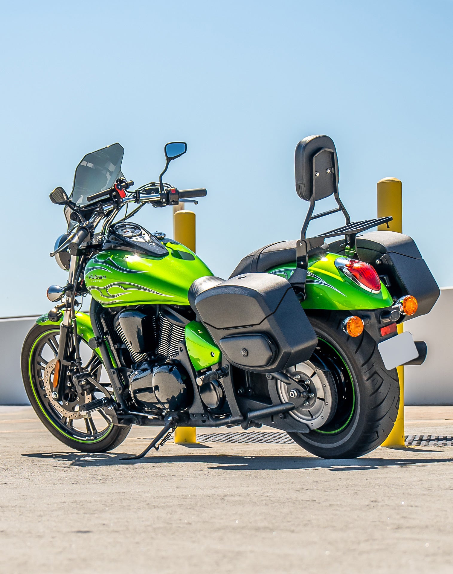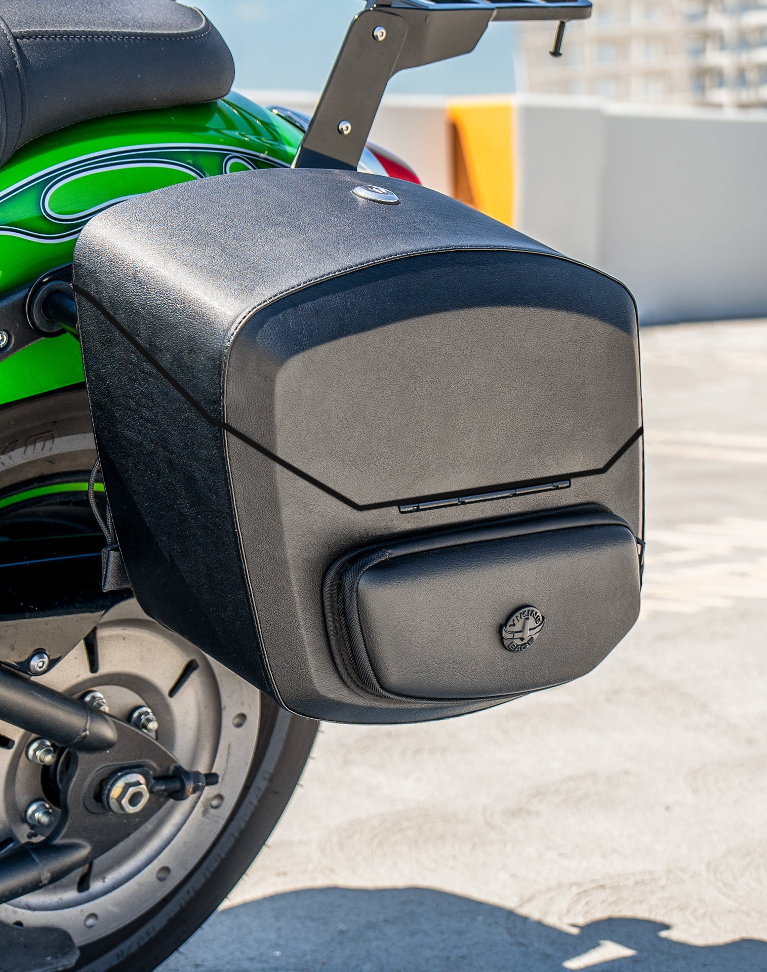 24L - Ironclad Quick-Mount Medium Kawasaki Vulcan 900 Custom Leather Wrapped Hard Saddlebags