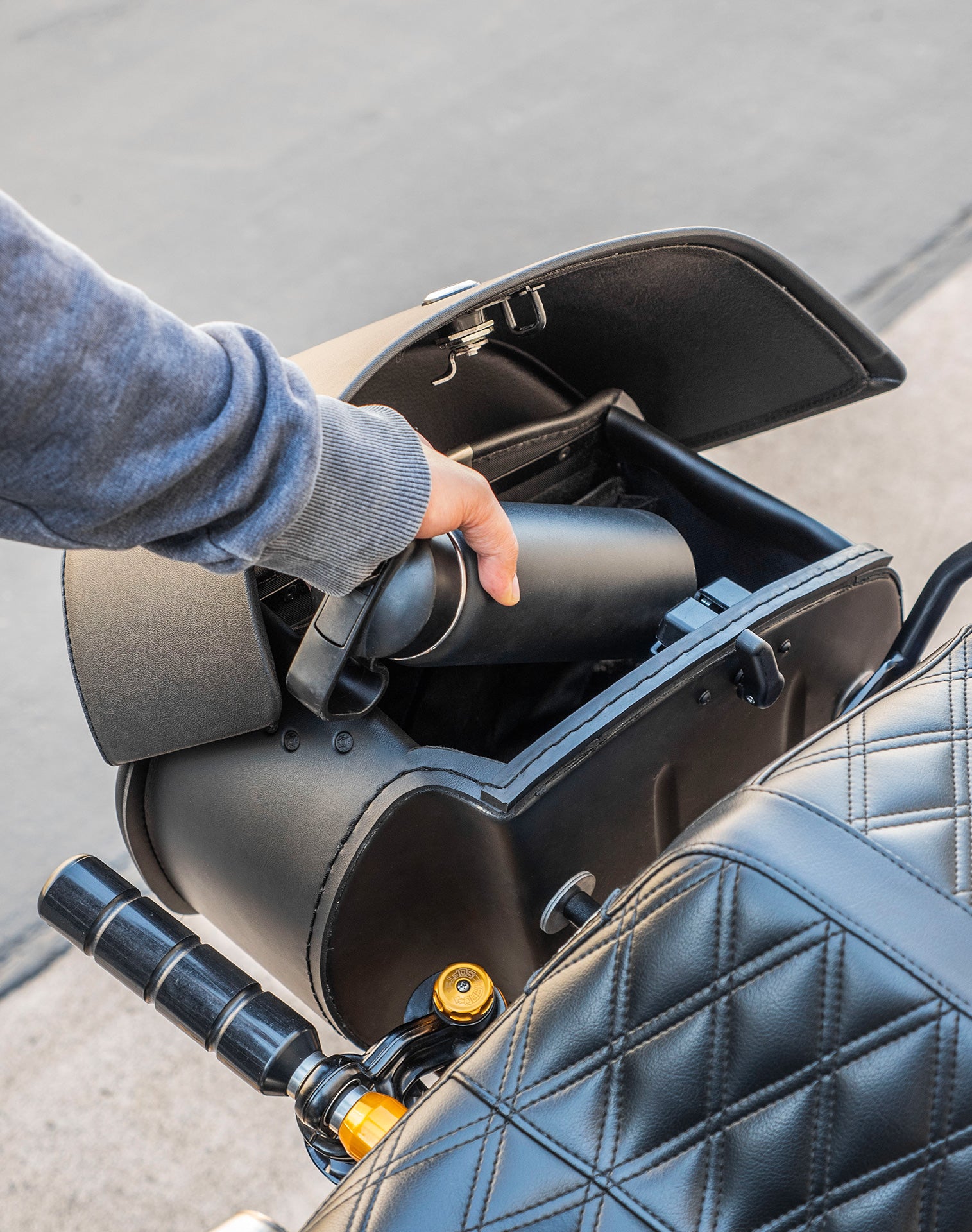 The Viking 32L Baelor large shock cutout saddlebags for Harley Super Glide are made of durable, water-resistant Viking leather. These lockable, hard-shelled bags retain their shape and offer 1952 cubic inches of storage, accommodating a half helmet. They feature a front-opening lid, embedded safety reflectors, and include mounting hardware.