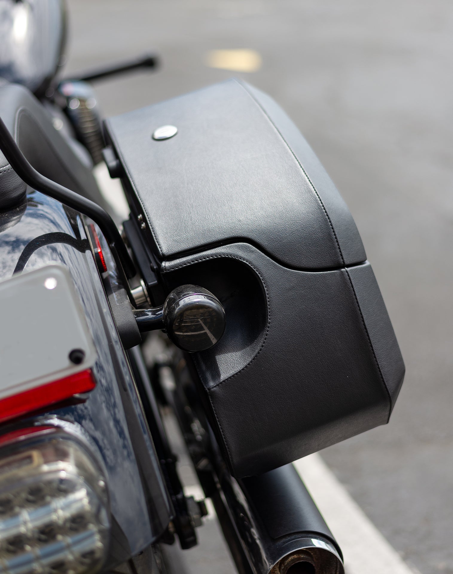 The Darkin Quick Mount leather saddlebags for Harley Low Rider S are a pair of aerodynamic saddlebags with a hard-shelled construction that provides ample storage space and security. The bags feature a tighter weather seal to keep water out, a key lockable opening, and an anti-theft feature that locks the quick disconnect system.